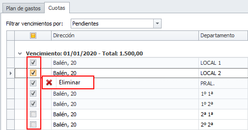 Se muestran las cuotas pendientes de emitir, ordenadas por vencimiento. Haciendo clic en la columna izquierda puede seleccionar los vencimientos que desee eliminar. Una vez seleccionados, haga clic derecho y escoja Eliminar.
