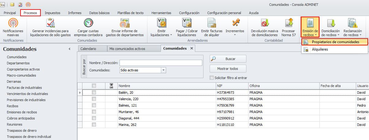 Se abre el asistente de emisión de recibos donde debe especificar la fecha de emisión y si desea emitir los de una comunidad en concreto o los de todas.