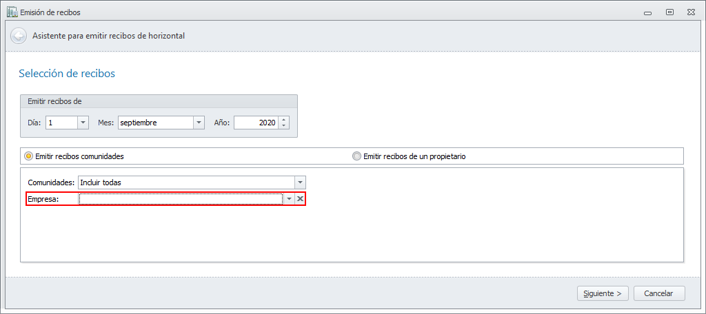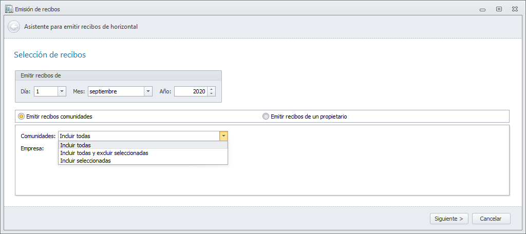 Sólo si en Comunidades se ha escogido Incluir todas o Incluir todas y excluir seleccionadas, se muestra y solicita la casilla Empresa, para permitirle escoger una empresa y emitir exclusivamente sus recibos.
