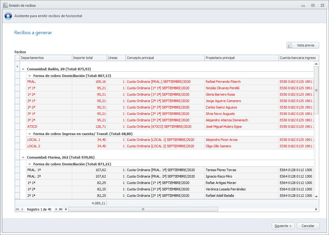 El siguiente paso muestra una lista con los recibos que se van a generar. Observe en la siguiente imagen, que los recibos de la comunidad Bailen 20 están en rojo. Esto indica que se está saltando la emisión de algún mes de esa comunidad. Se debe revisar que está pasando antes de continuar con la emisión. Si está todo correcto, puede continuar.