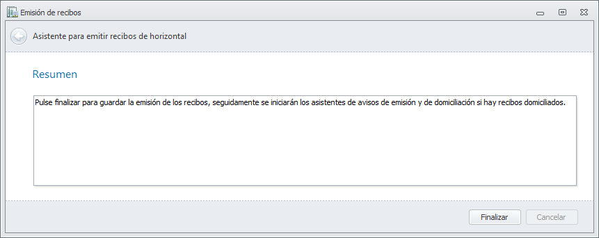 Al hacer clic en Siguiente, finaliza la emisión de recibos y se muestra esta ventana, en la que avisa de que se activarán los asistentes de avisos de emisión y de domiciliación.