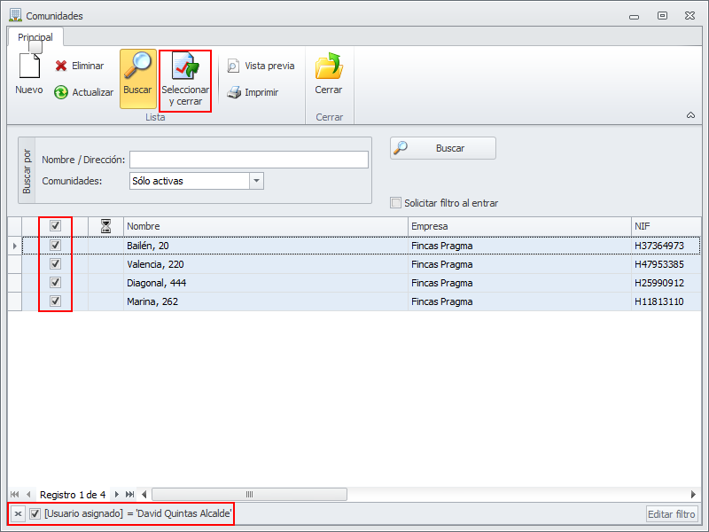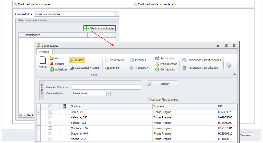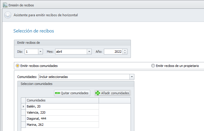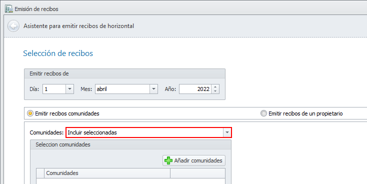 Ejecute el proceso de emisión de recibos. Se abre el asistente. En el selector de comunidades, escoja Incluir seleccionadas.