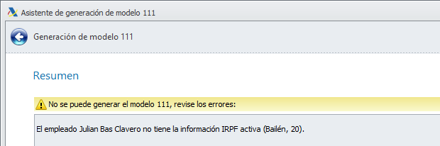 Error: "El empleado XXX no tiene la información IRPF activa" en asistente del modelo 111