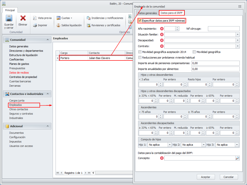 Para subsanarlo se debe acceder a la sección Empleados de la ficha dela comunidad y abrir la ficha del empleado. En la pestaña Datos para el IRPF se debe activar la casilla Especificar datos para IRPF nóminas y cumplimentar la ficha correspondiente.