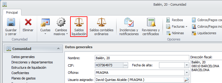 El botón Saldos liquidación se encuentra en la cinta de botones de la ficha de la comunidad.