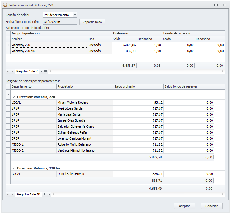 Introduciéndolos manualmente uno por uno. Si dispone de informe que le reporta los saldos individuales de cada departamento, introduzca el saldo y la fecha de la última liquidación. Introduzca también el desglose del saldo a nivel de departamentos. En la casilla Redondeo debe indicar la cantidad del saldo no repartida a causa del redondeo en el reparto. Haga clic en Aceptar para guardar los datos.
