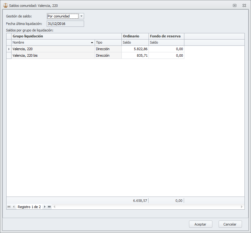 Introduzca el saldo y la fecha de la última liquidación y haga clic en Aceptar. Recuerde Guardar y cerrar después la ficha de la comunidad para que se guarden los cambios realizados.