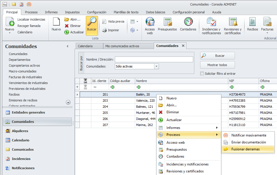 Para fusionar una derrama, vaya a la lista de comunidades, haga clic derecho sobre la comunidad y escoja Procesos -> Fusionar derramas.