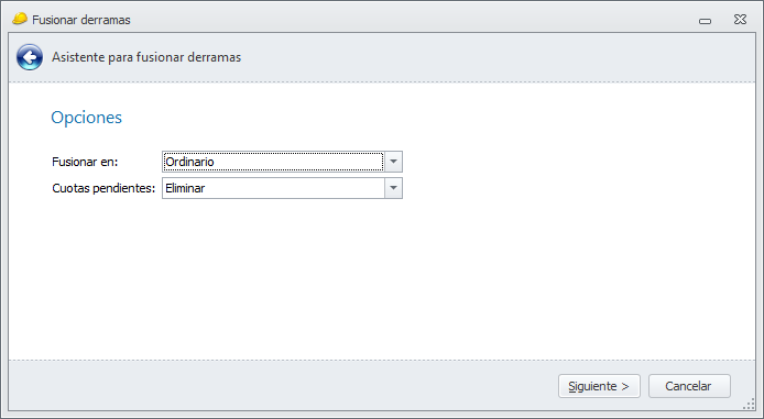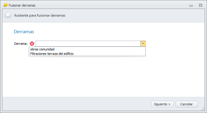 Se abre el asistente para fusionar derramas. Seleccione la derrama que desea fusionar y haga clic en Siguiente.