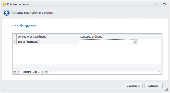 En la siguiente ventana del asistente, se solicita qué concepto del plan de gastos se debe asignar a los gastos comunitarios registrados en la derrama.