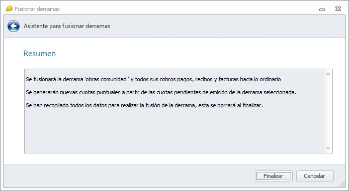 En cualquier momento de la gestión de una derrama, puede decidir fusionar esa derrama con la liquidación ordinaria, con la liquidación del fondo de reserva o con otra derrama. En ese caso, tanto los recibos como las facturas, ya estén cobrados o pendientes, pasan a pertenecer a la liquidación de destino, eliminándose la derrama.