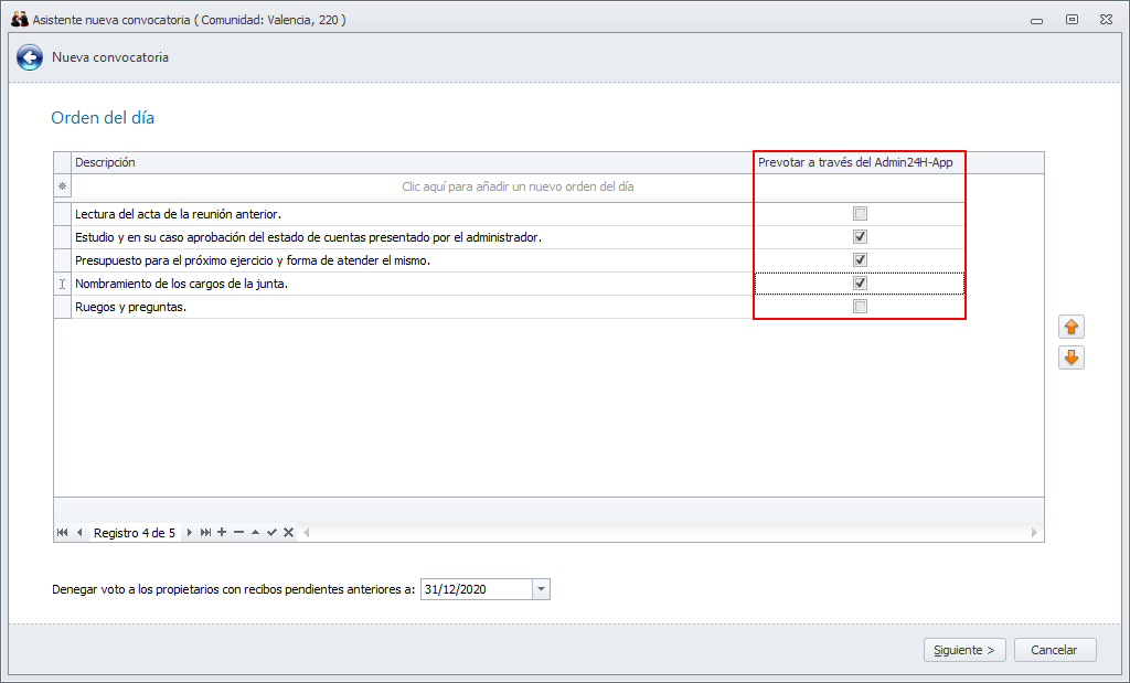 En la ventana Orden del día del asistente de nueva convocatoria, se añade una columna que permite, activándola que los propietarios emitan sus votos a través de la app Adminet24H.