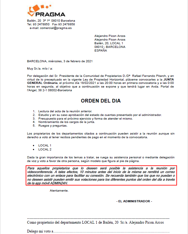 Si se va a permitir a los propietarios asistir a la reunión a través de videoconferencia, lo mejor es añadir un texto en la convocatoria anunciándolo. El texto podría ser aproximadamente el siguiente: