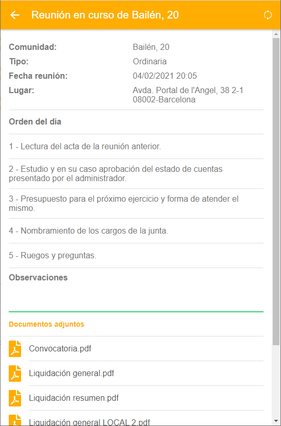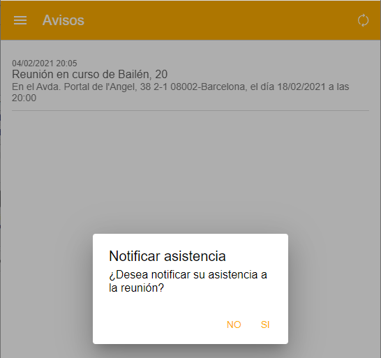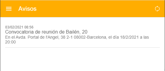 Si la reunión es online, los propietarios (tanto los que asisten presencialmente como os que lo hacen por videoconferencia) pueden acceder a la convocatoria desde sus dispositivos móviles (ADMINET24H APP). El aviso que anunciaba la convocatoria, ahora indica que la reunión está en curso.