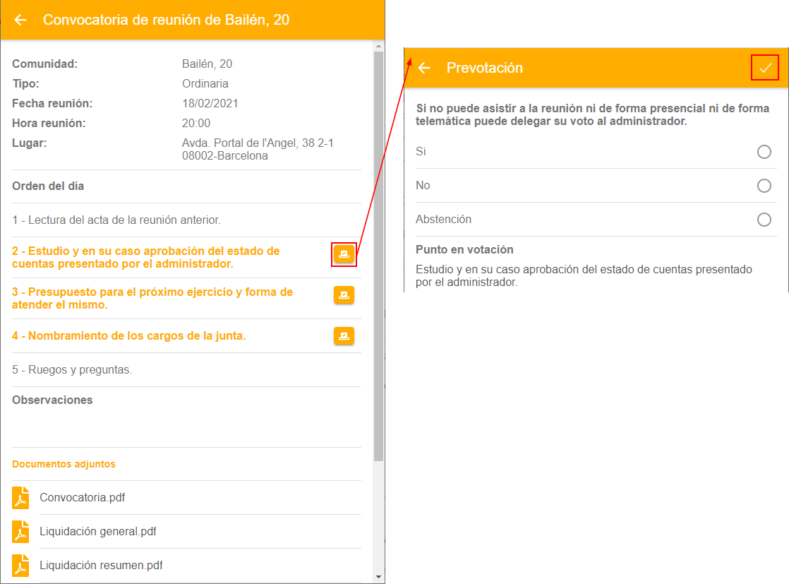 El resto de asistentes (tanto los que asisten presencialmente como os que lo hacen por videoconferencia) pueden emitir sus votos. Los que lo deseen lo pueden hacer a través de la app ADMINET24H. En este caso, el punto de orden del día se muestra en color naranja. Pulsando sobre la imagen que acompaña esa línea, el propietario puede emitir su voto. Para validar el voto, debe hacer clic en el dibujo de la parte superior derecha de la ventana.