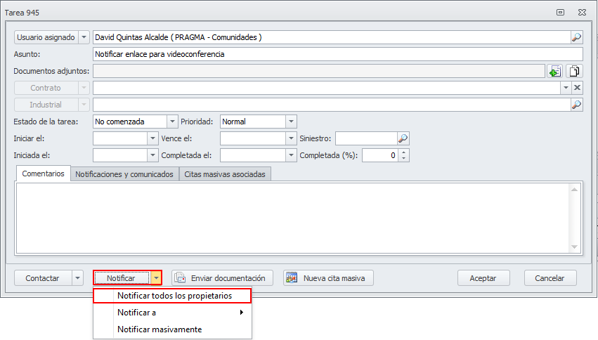 Desde la tarea Notificar enlace para videoconferencia, haga clic en el botón Notificar y escoja Notificar todos los propietarios.