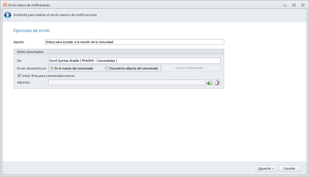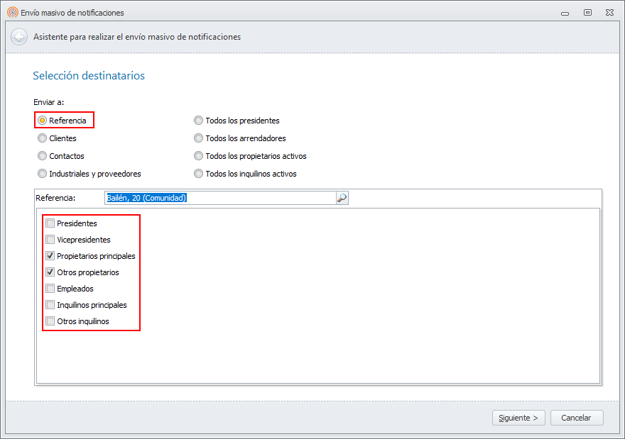Se abre el asistente de envío de notificaciones. Compruebe que está activa la casilla Referencia, que la comunidad es la que está gestionando y active los tipos de contacto a los que quiere notificar.