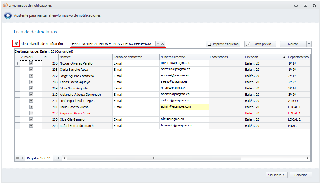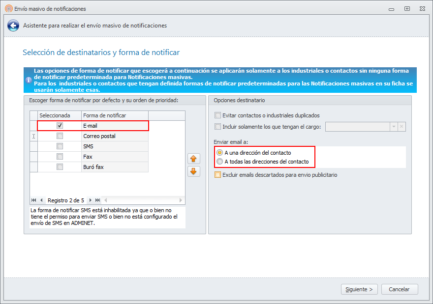 Deje activa únicamente la forma de notificar E-mail (desactive Correo postal). Decida si quiere enviar el correo a una sola dirección de los contactos o a todas las direcciones que tenga de cada uno de ellos.