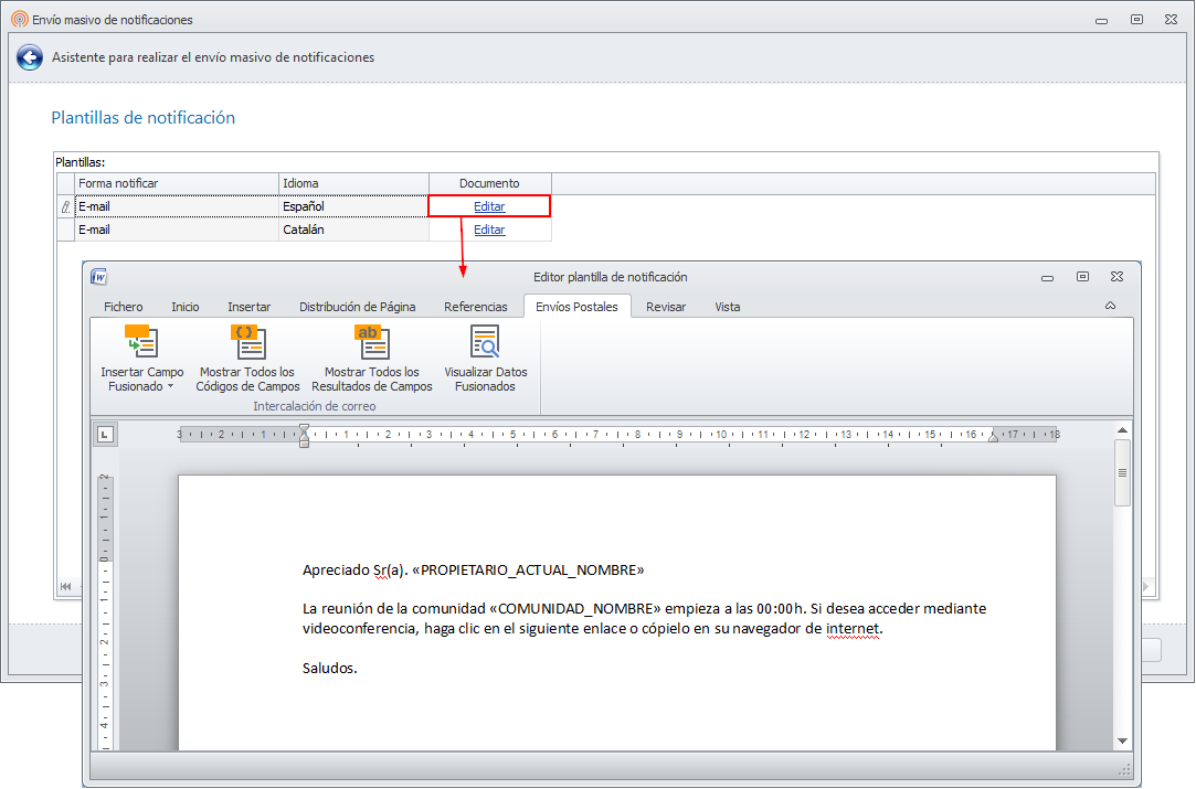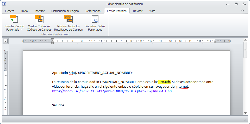 Personalice el envío, añadiendo el enlace para la videoconferencia y otros datos que necesite, como por ejemplo la hora de inicio de la reunión. Debe editar la plantilla en todos los idiomas en que la disponga.
