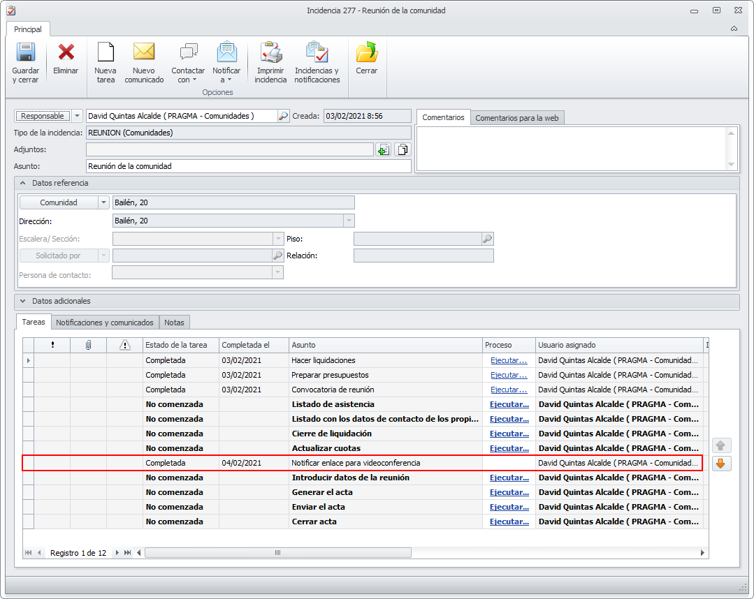 Antes de iniciar la reunión, debe enviarse un comunicado a los propietarios con el enlace de la videoconferencia. Es recomendable hacerlo aunque ya se incluyera ese enlace en la convocatoria. Sirve como aviso de que la reunión está punto de empezar. La mejor forma de comunicarlo es desde la propia incidencia, para que estos comunicados queden vinculados y se puedan atender posibles reclamaciones de forma fácil.