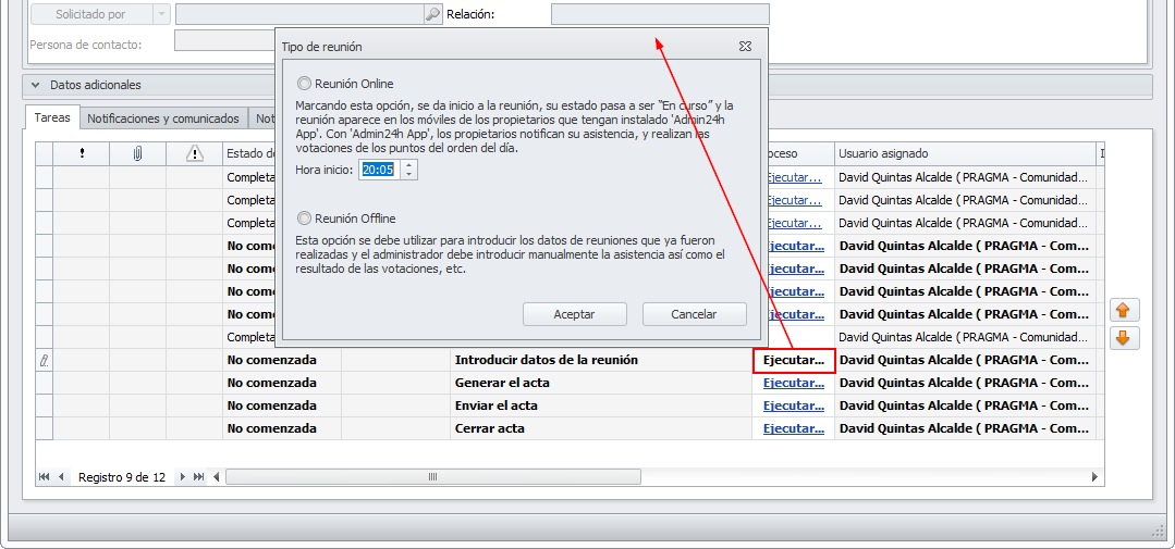 Cuando se accede a la tarea Introducir datos de la reunión, se solicita si la reunión se gestiona on line o en diferido (off line).
