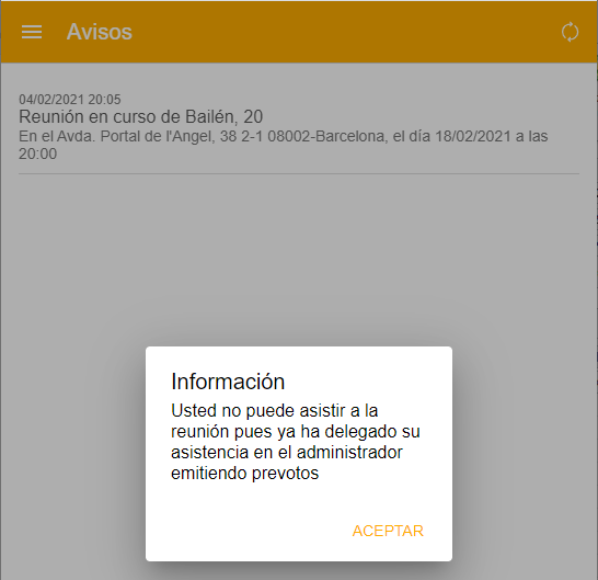 Si un propietario delegó el voto en el administrador, su participación ya no es posible, mostrando este mensaje.