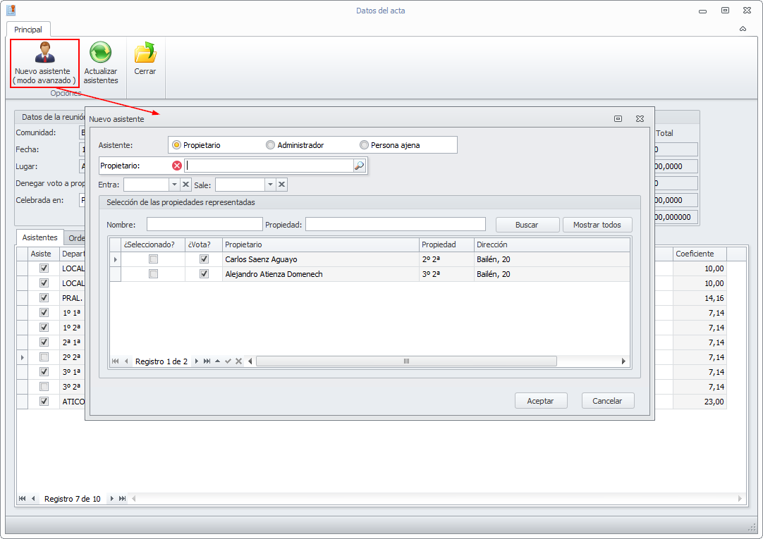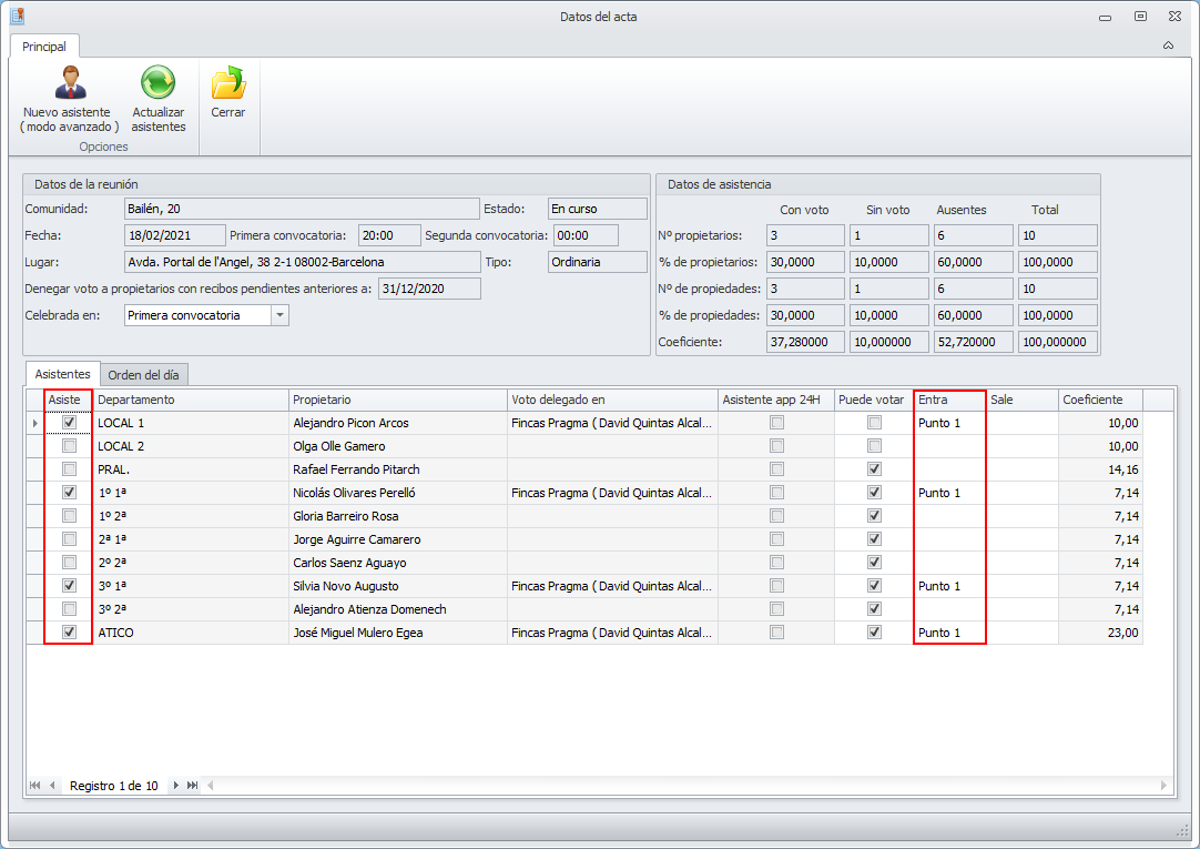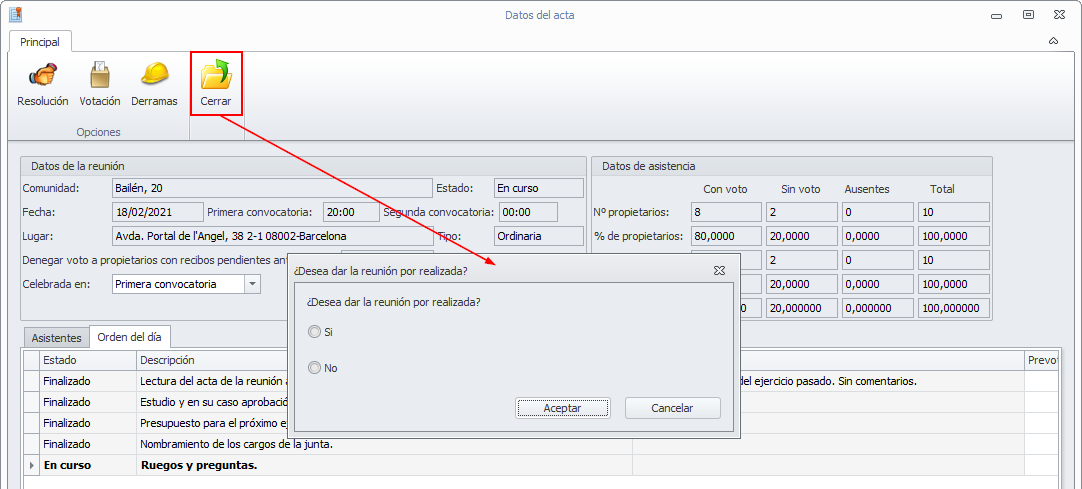Para los demás propietarios, se solicita si quiere ingresar en la reunión. Si responde Sí, se contabiliza su asistencia en la reunión del administrador.