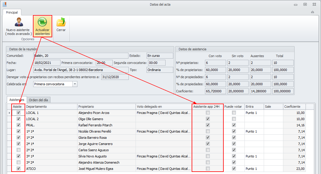 Los que accedan a través de videoconferencia o presencialmente, deberán ser registrados por el administrador. Si acceden a través de ADMINET24H app, el administrador sólo debe hacer clic en el botón Actualizar asistentes para que se registre la lista.