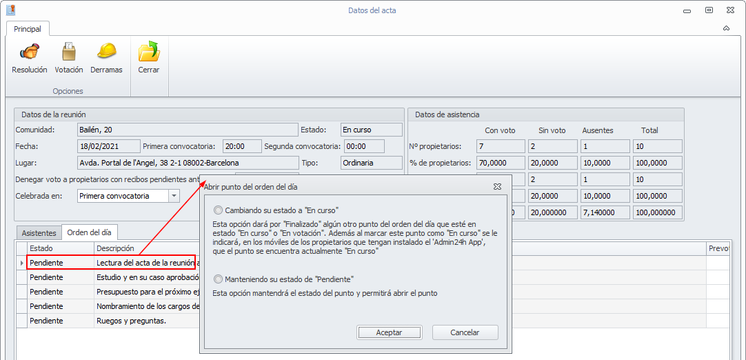 Pendiente. Permite abrir el punto, dejando el estado como Pendiente. Esta opción impide a los propietarios seguir el punto del orden del día desde el móvil y emitir votaciones.