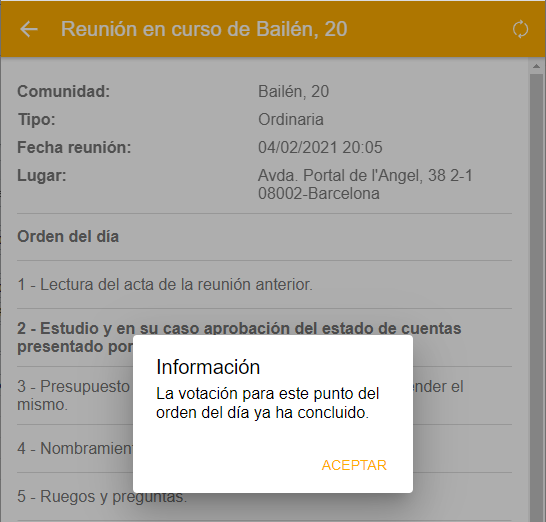 En curso. Marca como Finalizado cualquier otro punto que esté En curso o En votación, dejando el punto escogido En curso. Esta opción permite a los propietarios seguir el punto del orden del día desde el móvil y emitir votaciones.