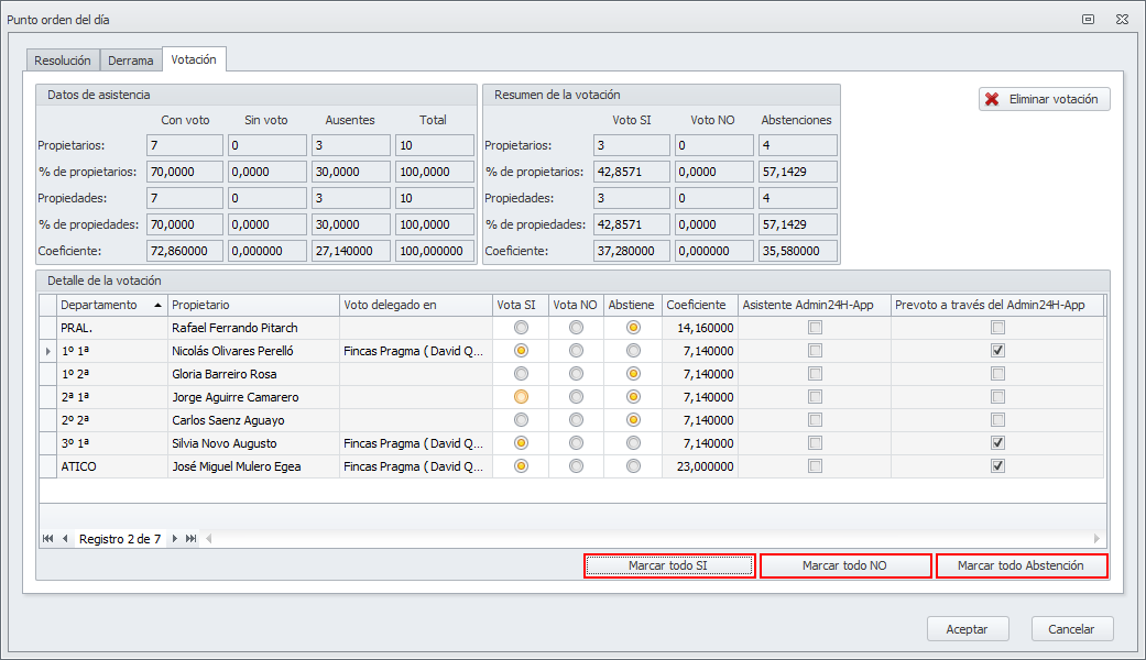 En la parte inferior de la ventana dispone de botones que permiten asignar el voto “Sí”, “No” o “Abstención” a todos los asistentes de una sola vez, excluyendo los que intervienen a través de Adminet24h app, ya sea con prevotación o con asistencia directa.