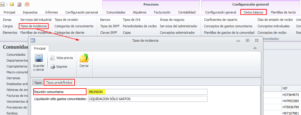 Abra esta opción, vaya a la pestaña Tipos predefinidos y vea el título asociado a Reunión comunitaria. En el siguiente ejemplo es REUNION.