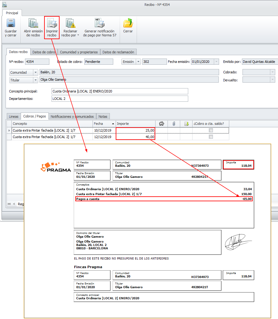 Al hacer clic en el botón Imprimir recibo de la parte superior de la ficha, en el caso de que esté pendiente de cobro, muestra el recibo correspondiente a la parte pendiente. En caso de tener cobros a cuenta, los detalla en cuerpo del recibo, descontándolos del importe.