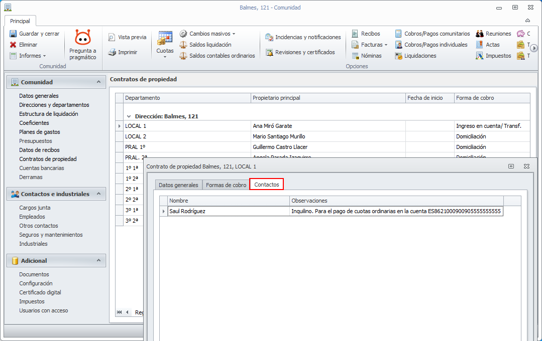 También puede añadir los datos del inquilino o cualquier otro contacto relacionado con el departamento, en la pestaña Contactos.