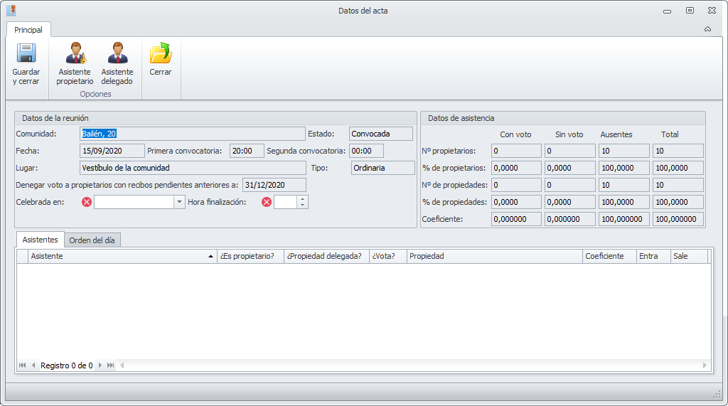Con Asistente delegado identifique a los que acuden en representación de otro propietario. El asistente puede ser otro propietario o bien una persona ajena a la comunidad. Si es otro propietario, escoja el propietario que asiste y en la lista inferior seleccione los propietarios a los que representa.