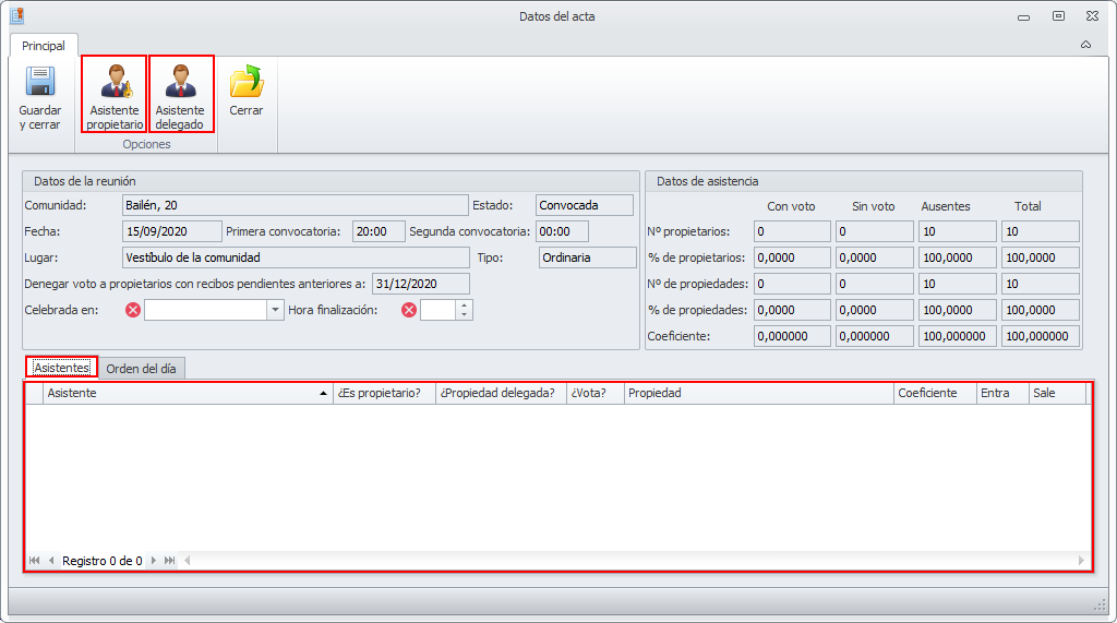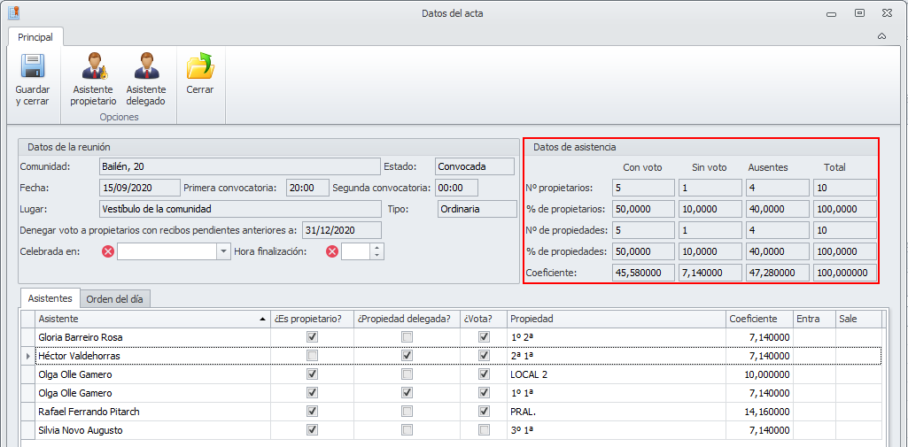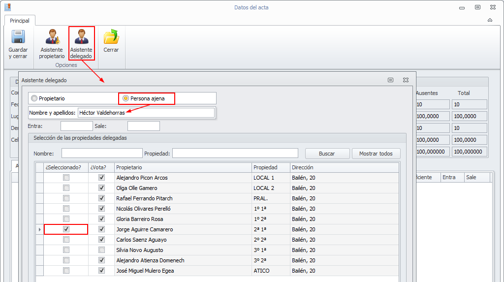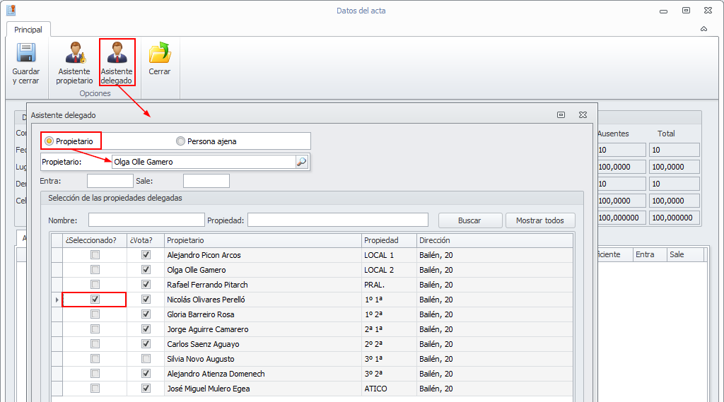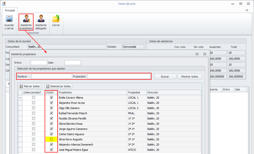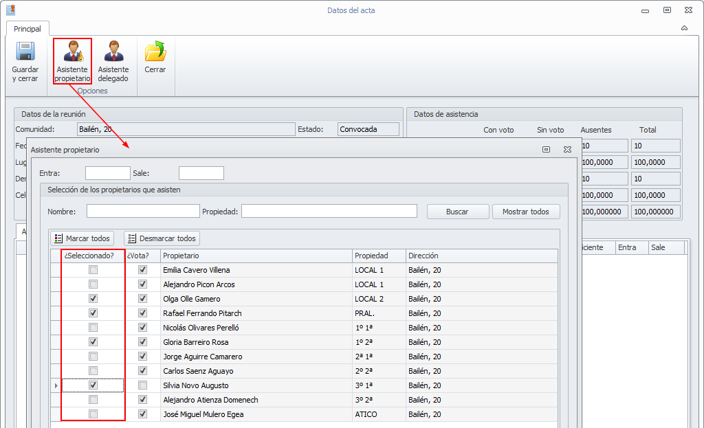 Seleccione los propietarios asistentes, marcándolos en la columna Seleccionado.