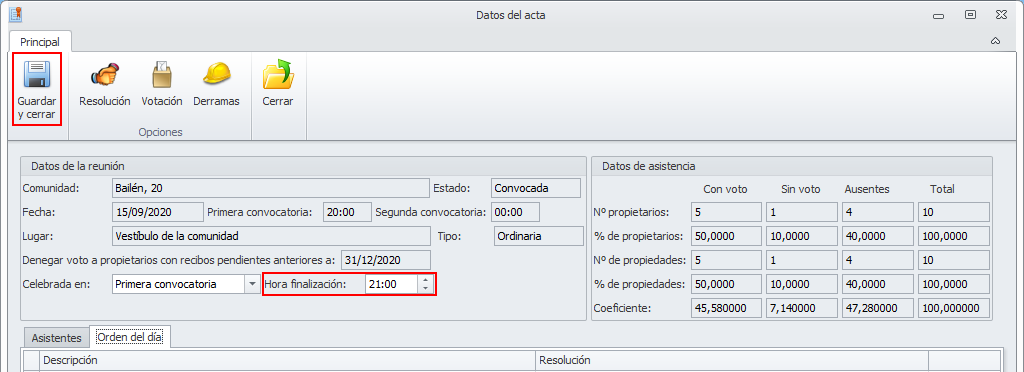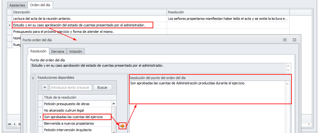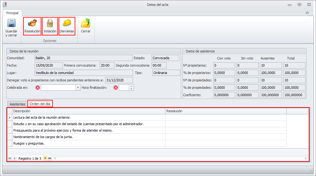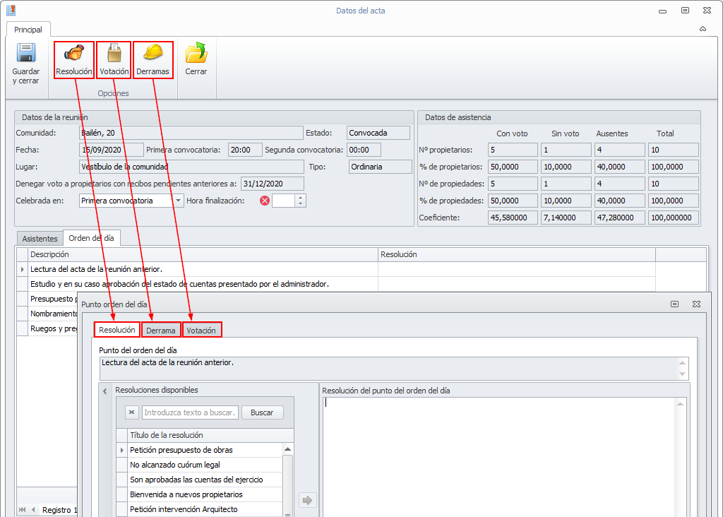 Cuando se sitúe en la pestaña Orden del día, se mostrarán tres botones: Resolución, Votación y Derramas.