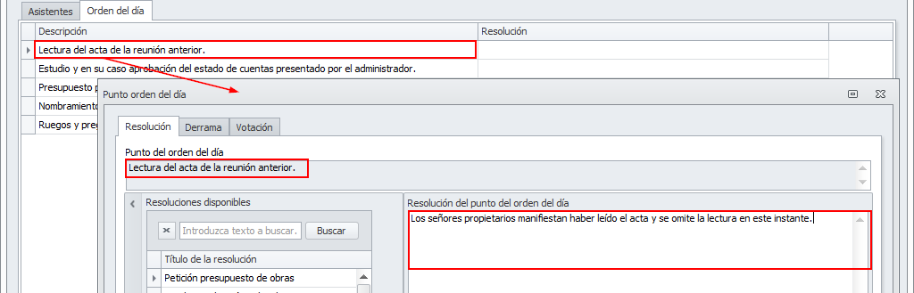 Para informar cada punto, puede hacer doble clic sobre él o marcarlo y hacer clic en los botones Resolución, Votación y Derrama. Al hacerlo se abre una ventana con tres pestañas, en las que introducir la información correspondiente a ese punto.
