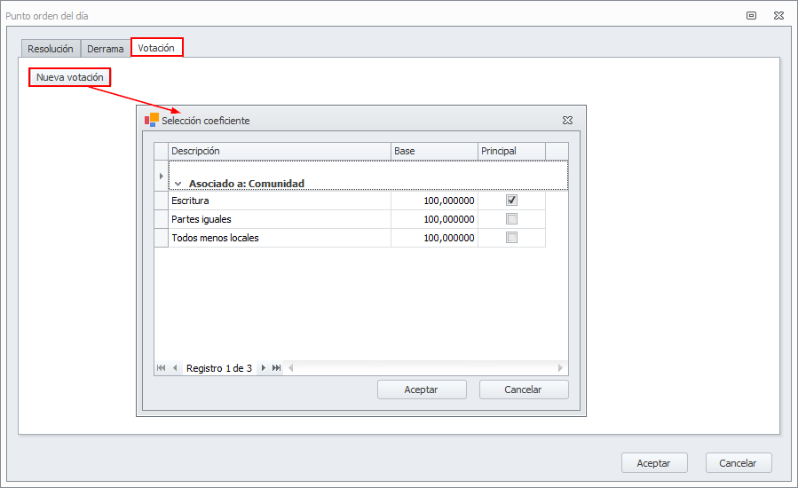 Si un punto requiere votación, vaya a esa pestaña y haga clic en Nueva votación. Escoja el coeficiente por el que se va a realizar el cálculo de los votos.