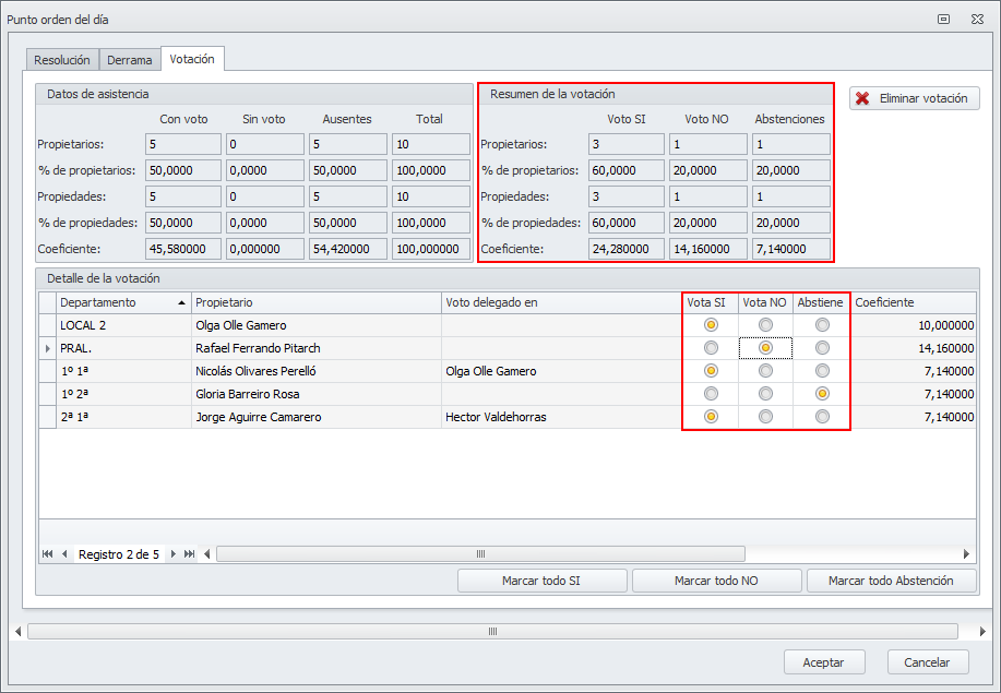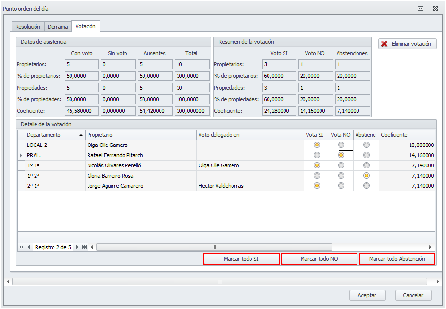 En la parte inferior de la ventana dispone de botones que permiten asignar el voto “Sí”, “No” o “Abstención” a todos los asistentes de una sola vez.
