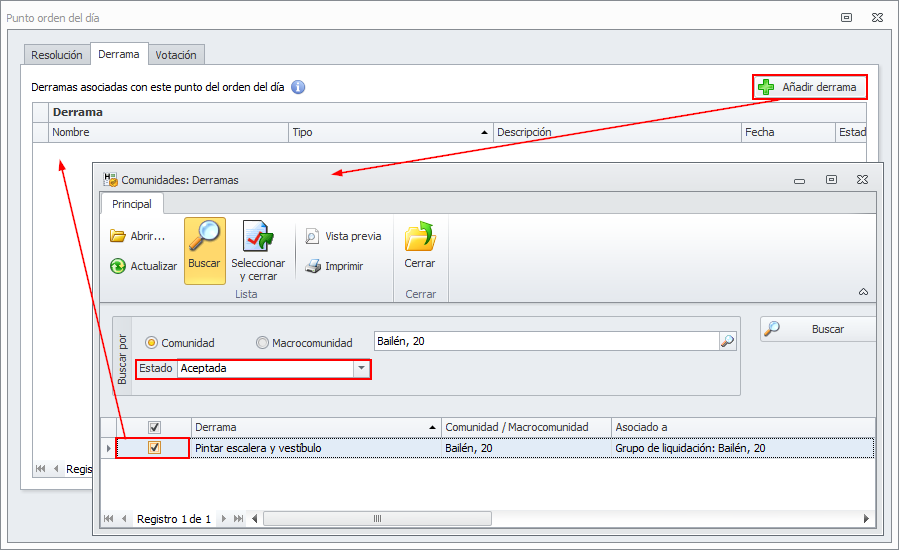 Puede vincular una derrama aceptada con un punto del orden del día, haciendo clic en el botón Añadir derrama.
