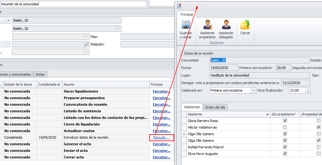 Aunque la tarea esté marcada como completada, si hace clic en Ejecutar, se abrirá de nuevo la reunión y podrá modificarla o completarla, siempre que no haya generado el acta.