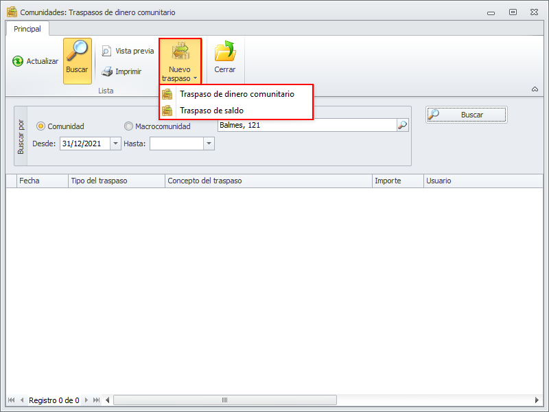 Dispone de un botón que permiten realizar nuevos traspasos de dinero comunitario o de saldos individuales.