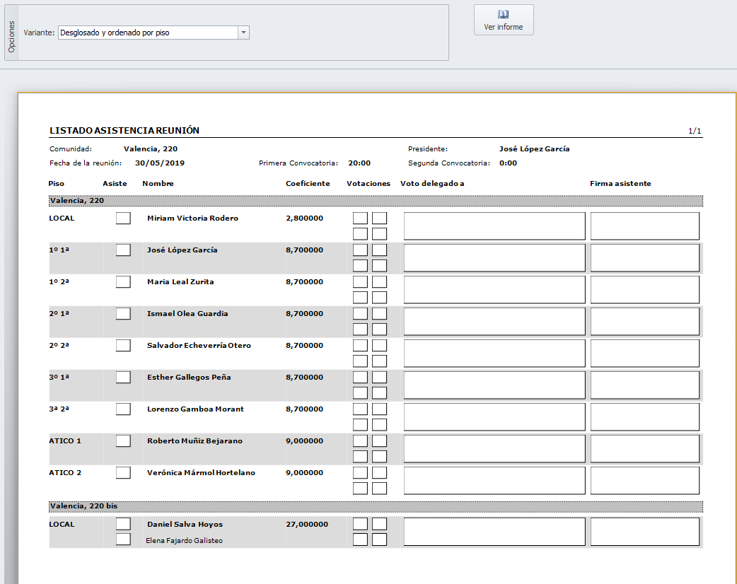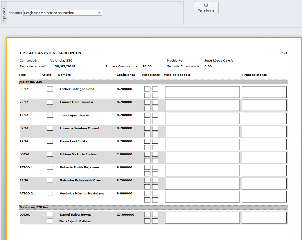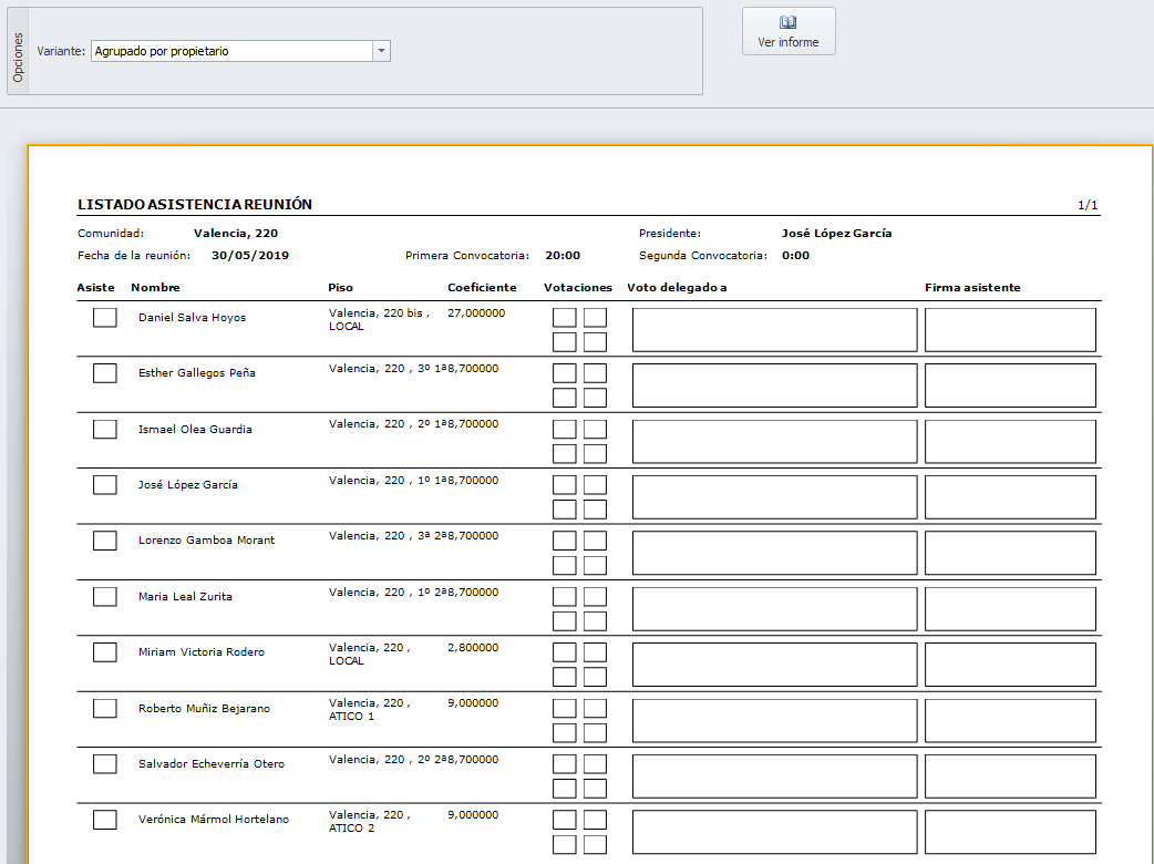 Listado de asistencia desglosado y ordenado por nombre de propietario