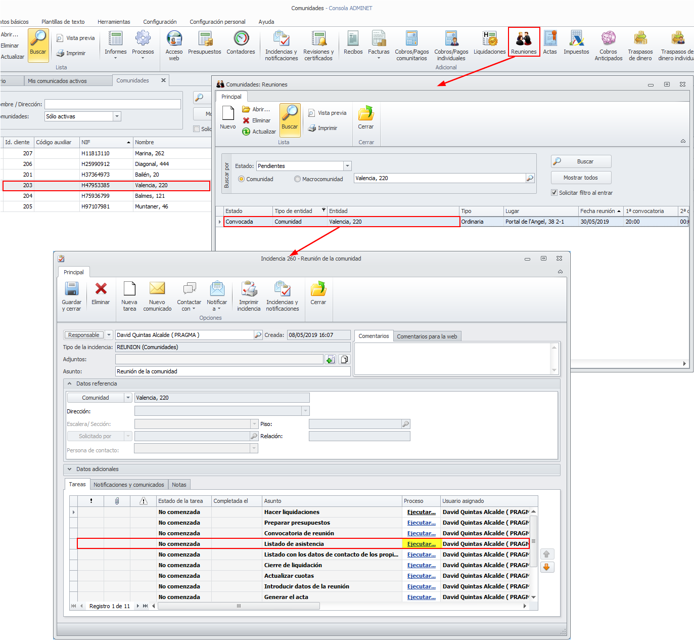 Al informe de asistencia para reuniones se accede a través del botón Reuniones de la comunidad. Al escoger una reunión se abre la incidencia que reúne las tareas a realizar, una de las cuales es obtener el listado de asistencia. Se debe hacer clic sobre el texto Ejecutar....