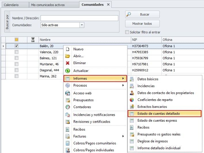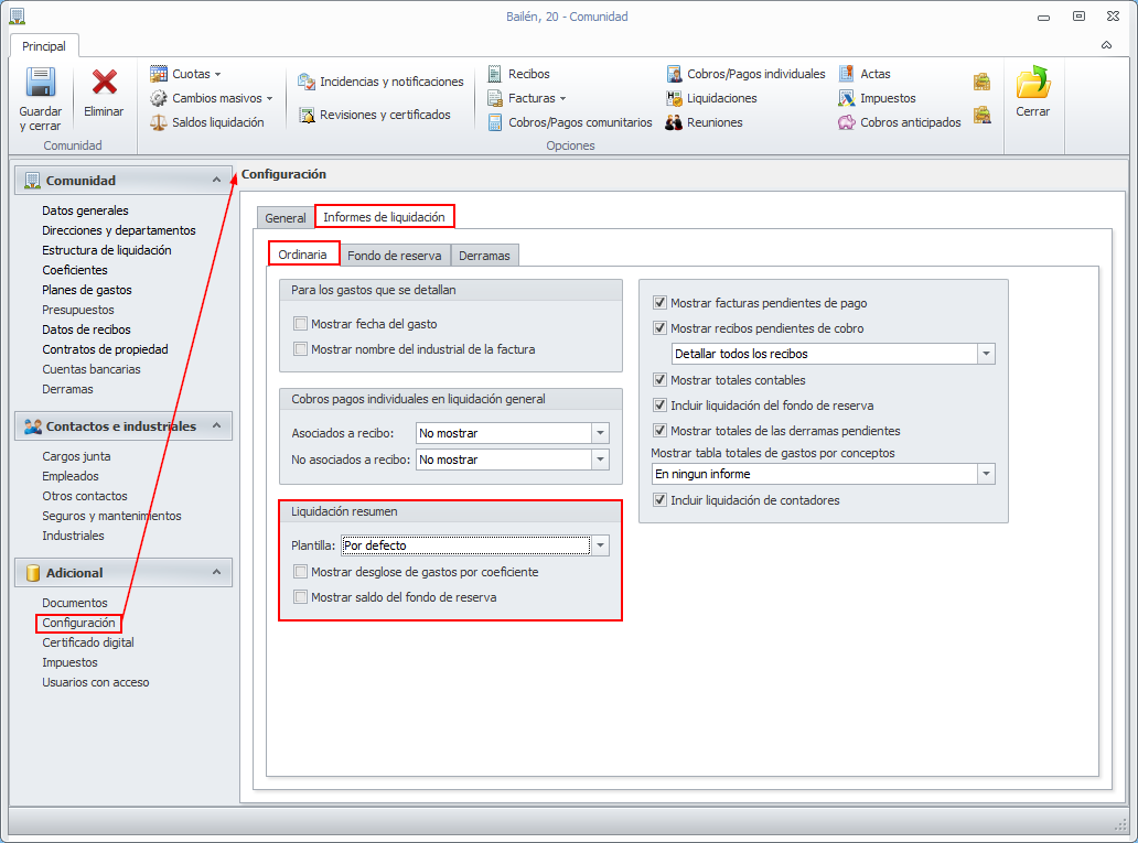 El diseño de la liquidación resumen se puede personalizar para cada comunidad, abriendo su ficha y situándose en la sección Configuración como se muestra en la siguiente imagen.