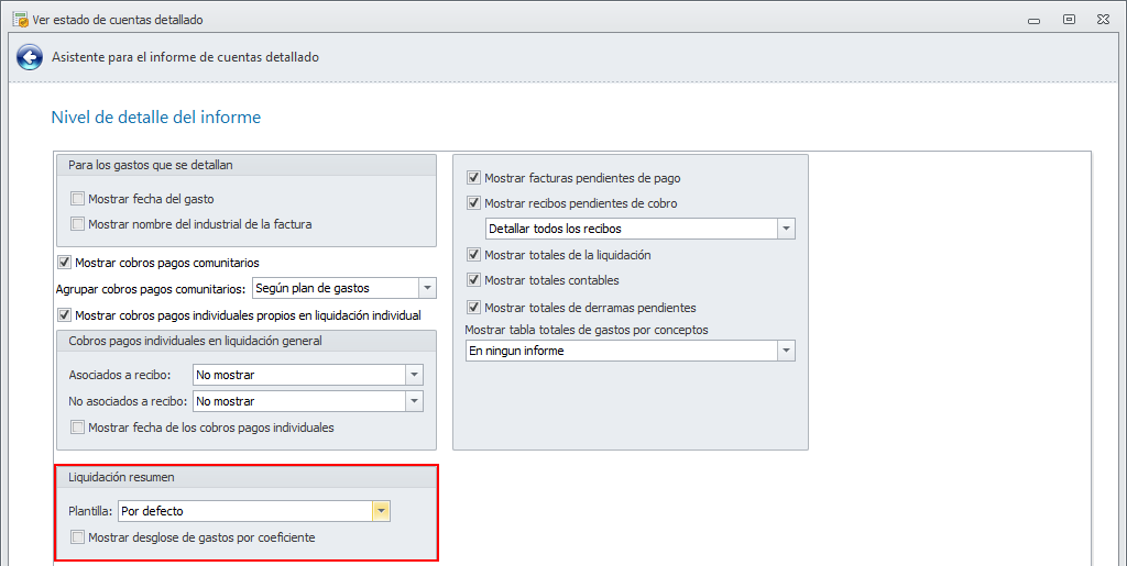 Las opciones Mostrar desglose de gastos por coeficiente y Mostrar saldo del fondo de reserva son únicamente seleccionables para la plantilla Por defecto.
