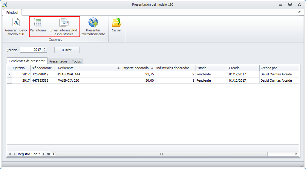 El botón Enviar certificados está disponible únicamente al acceder a la pestaña Presentados y remite a los industriales y a los empleados de la comunidad el certificado oficial de retenciones para su declaración de renta.