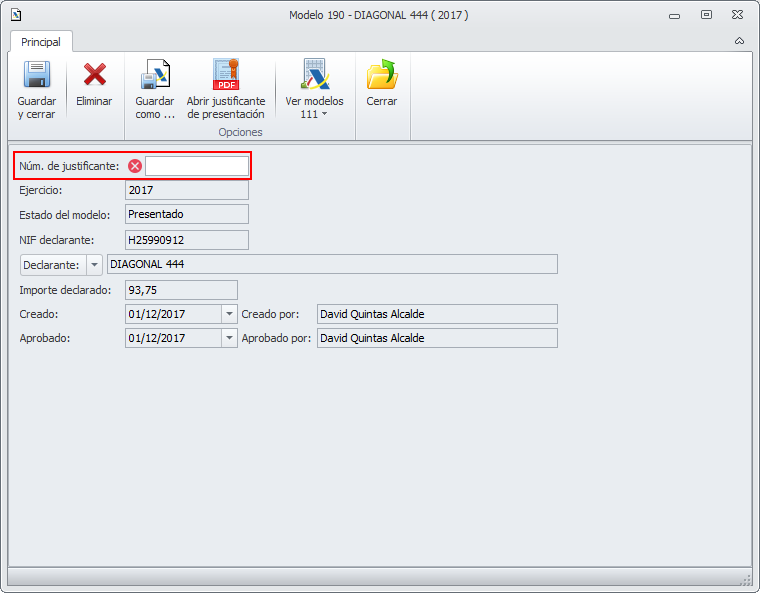 Desde la ficha de un modelo presentado, además de obtener una copia del fichero txt, a través del botón Guardar como, se puede abrir el justificante de presentación.