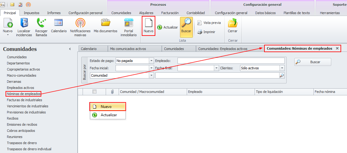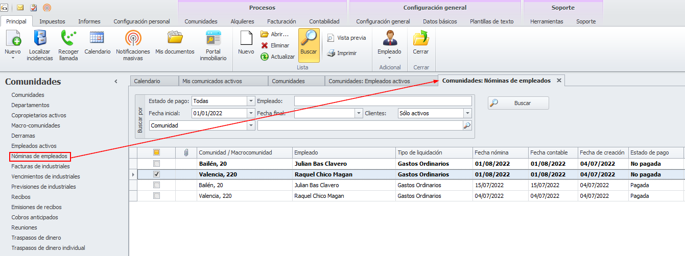 La vista Nóminas de empleados muestra los registros de nómina generados desde adminiet para su pago a los empleados de las comunidades. La ventana tiene el siguiente aspecto.